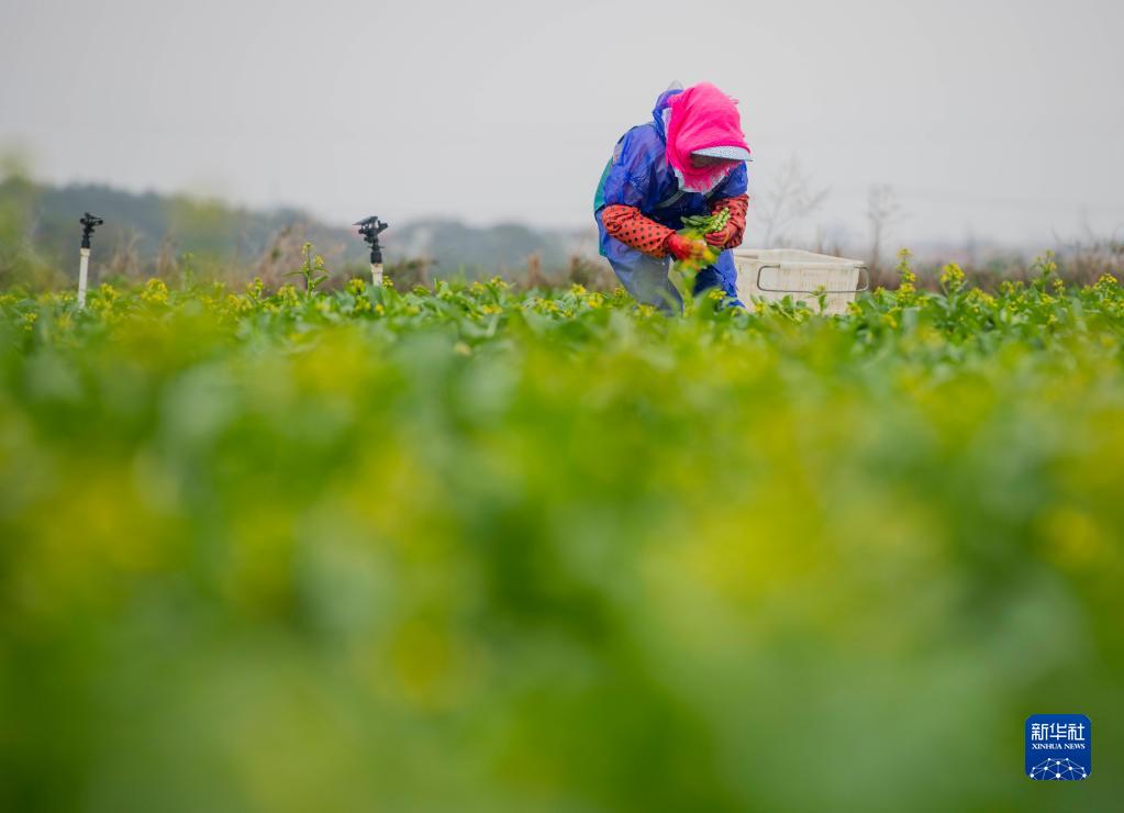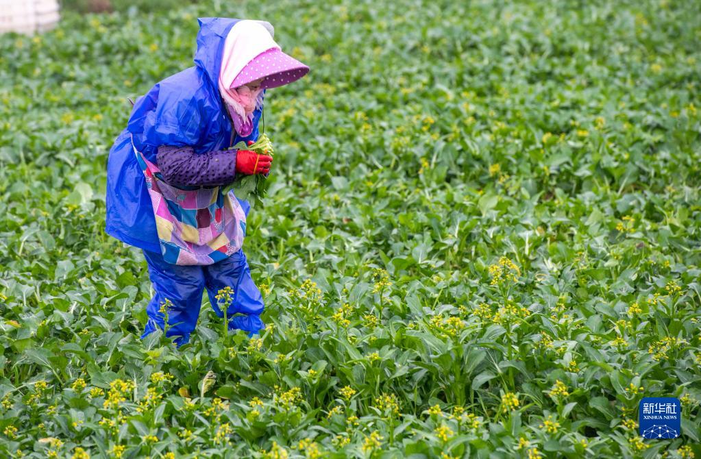 12月4日,在湖南省永州市道县清塘镇室家村,村民在蔬菜基地采摘蔬菜。