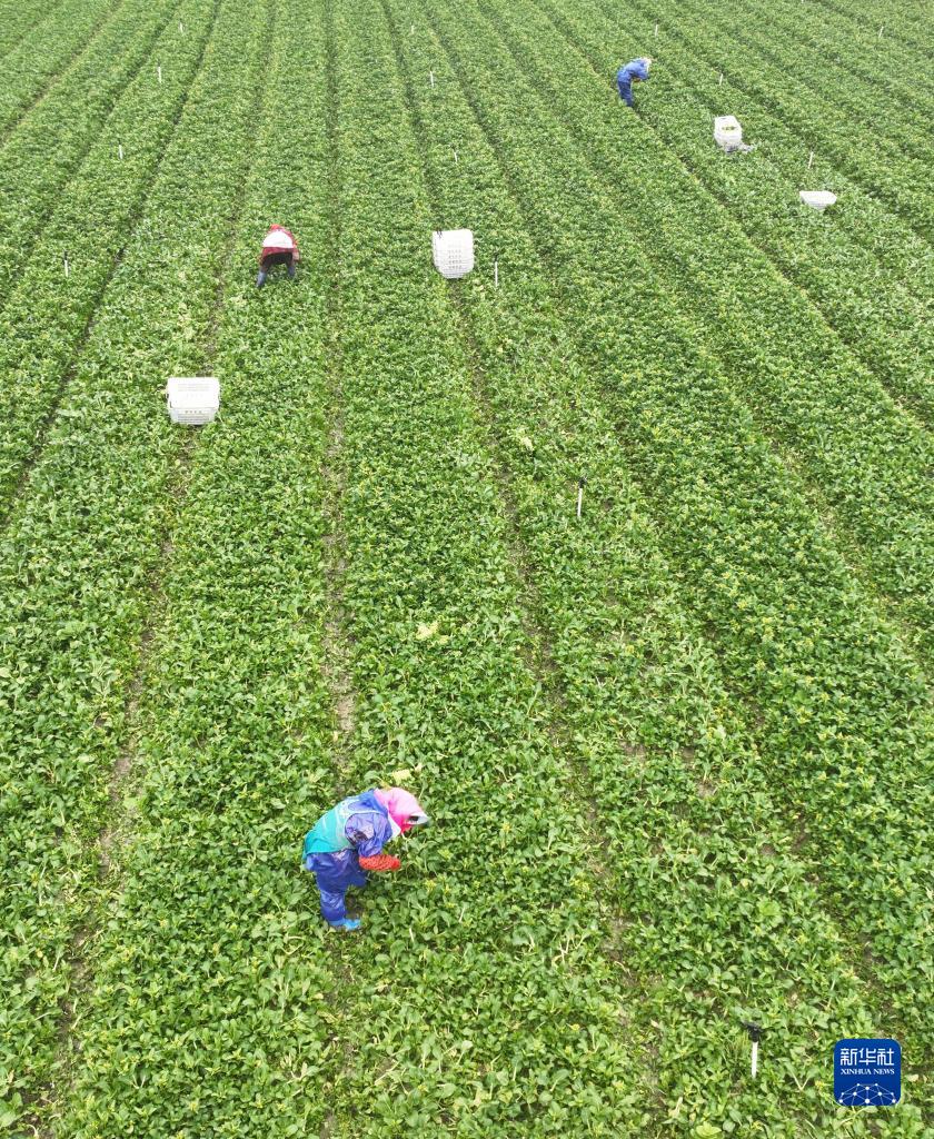 12月4日,在湖南省永州市道县清塘镇室家村,村民在蔬菜基地采摘蔬菜(无人机照片)。