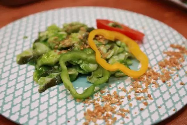9.出锅后,用彩椒摆盘,撒上炸蒜蓉,即可食用。