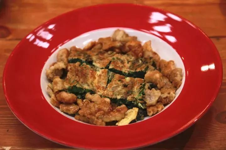 5、锅内放油,将菠菜放入鸡蛋液中包裹均匀后,放入锅中煎至两面金黄,放入高汤、五花肉盖上盖子焖煮片刻,盛出,备用;